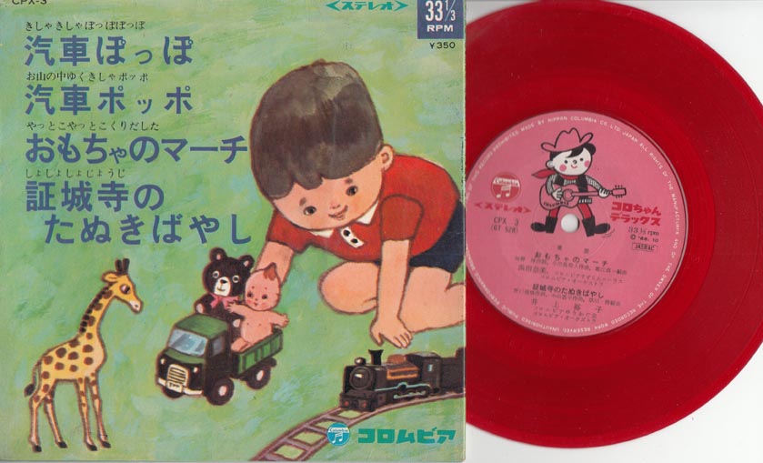 これ昔持ってたなぁ。でも赤盤ではなかったと思うな。汽車ぽっぽのほうは「汽車 汽車 ポッポ ポッポシュッポ シュッポ シュッポッポ」で、汽車ポッポのほうは「おやまの なかいく きしゃぽっぽ」ですねぇ。同じ題名でもひらがなとカタカナでは違うんですね。それを同じ晩に乗せたってすごいぞコロちゃんデラックス。