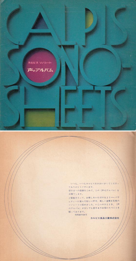 昭和40年10月って書いてあるから、1965年に応募された中から当選者に送られたであろうカルピスのソノシート集。5枚くらいあって、すべての色が違うというさすが天下のカルピス食品工業株式会社。当時はアサヒ飲料の子会社ではなかったよね。歌ではなくて語り、森繁久彌さんや小島正雄さん高島忠雄さんなど有名な方が語ってます。その一部を紹介しますね。