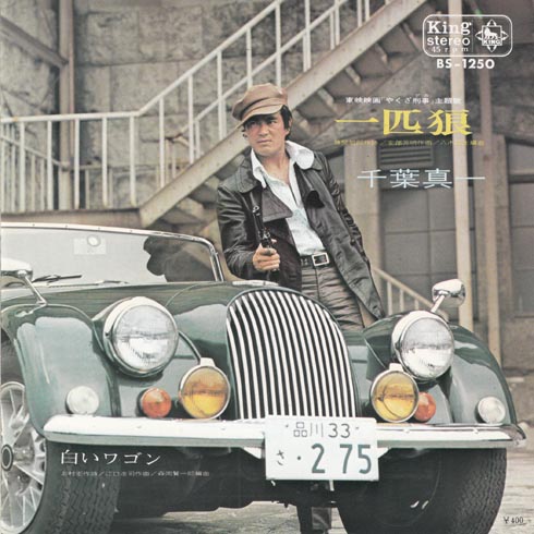 車ジャケですねぇ。モーガン8だと思われます。ルパンが乗っている車に似てるけど、あれはベンツだから。このシングルはキイハンターで人気者になった千葉さんが同じようなことを映画で、っていうことで「やくざ刑事」という映画を撮った時の主題歌だそうです。B面の白いワゴンは第2作「やくざ刑事 マリファナ密売組織」の挿入歌だそうで、乗馬シーンで聞けるそうです。