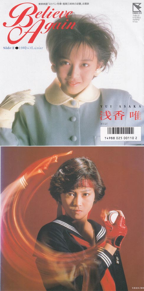 なんでも少女コミック主催の「ザ・スカウトオーディション'84」で漫画の主人公浅香唯賞」を受賞したそうです。それで芸名は浅香唯となったそうです。当時はアイドルで5枚くらいシングル出したけど全部100位くらいだったそうです。1986年10月からスケバン刑事III 少女忍法帖伝奇に出演した爆発的に売れたそうです。このシングルはスケバン刑事 風間三姉妹の逆襲という映画の主題歌です。2枚目は風間唯さんです。見たことないです。