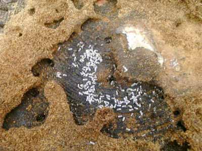 | 丸太の上に置いてあった植木鉢を取除くと、そこはアリの巣屈と化していました。白く見えるのはアリの卵です。それが次のシャッターを切るまでのほんの短い時間に、あっと言う間に穴の中へ運び込んでしまいました。それはそれは早業でビックリ!卵が消えてしまった状態の写真がぼけてしまって残念です。 |