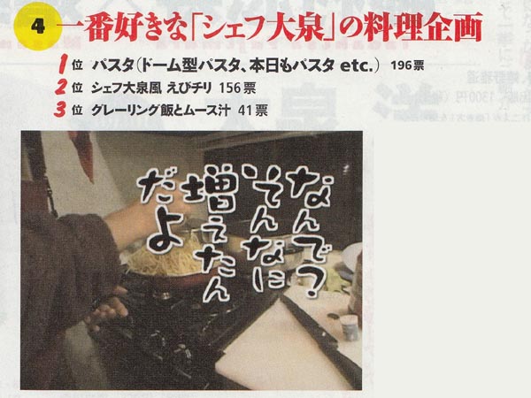ドーム型パスタですね。なんかうまくできた料理はカットしているそうです。お見舞いされた料理だけを放送しているって書いてました。でもユーコンではインスタントごちゃまぜもおいしかったし、最近の家建てますでも「またお磯雄物を作ってしまった」と言ってましたように腕が上がってますね。まぁバナナと肉料理は「怒るほどじゃない」と言ってましたが。それが名言になってないんだよあんぁ。なんでかなぁ。藤やんには引っかかってないかなぁ。