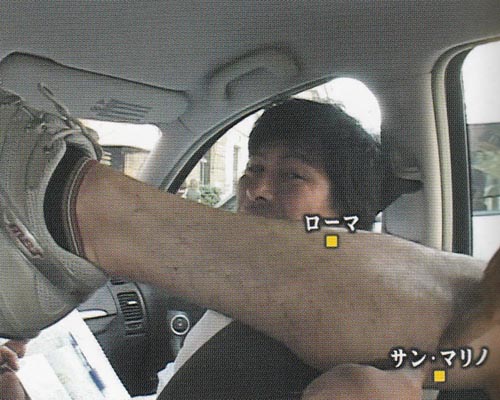 洋さんの足で脛のローマから、ふくらはぎのサンマリノに向かうという。しかしこのうるまの中での会話はまだバチカンですね。レンタカー屋さんが見つからず旅のカリスマも右往左往していたらしいです。しかも借りた車はマニュアル車。くじいた足でクラッチを踏む藤やん。一人としていたわりの言葉もありません。