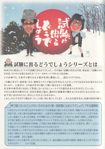 大泉さんの才能が光る語呂集。普通は「白紙に戻そう遣唐使」とか「いい国作ろう鎌倉幕府」とかね、そういったかたい語呂だけど、大泉さんにかかれば大変面白いのができました。さすが洋さん。試験に出るどうでしょうは3回やってます。初めは安田さん監禁した地理の問題の語呂ですね。