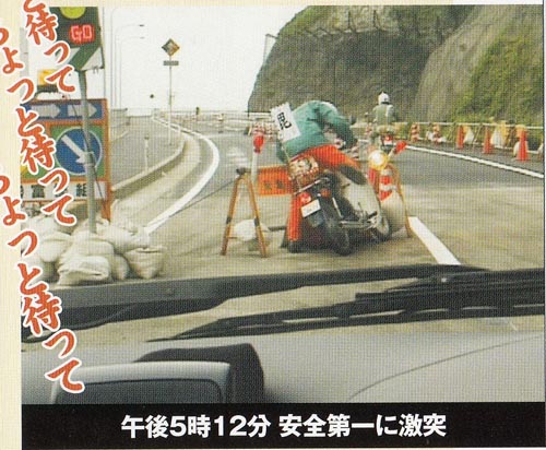 | 午後5時12分安全第一に激突 これが激突の瞬間。GOって書いてますもんね。あはは。この後、洋さんは平静を装って「あれ?ミスターは?」と藤やんに。「ミスター先行っちゃいましたけど」洋さん「あれなして先いっちゃったの?。赤、赤だったのにねぇ」とまで言いました。これは放送されなかったときのことを考えての編集点を作ってたらしいです。しかし藤やんの「安全第一に突っ込んでいきましたけど」といったとたんにこれは使われてるな、と判断した洋さんは「大丈夫じゃねぇよ。なまら怖かったよ。」と言いましたなぁ。「死ぬかと思ったよぉ」と洋さんは言ってましたが、うれしーは後日、大したことはないと言ってました。しかしこの事件のあと、ずっとテープを回すことにしたきっかけなんだそうです。 |