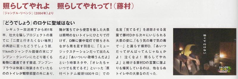 ジャングルリベンジですね。まぁブンブンに泊まるときはたいして面白くないんです。たぶん洋さんもこれは面白くなってないなぁって思ってたと思いますよ。そこで必死にウンコするところを見せたんじゃないかな。まぁおなか痛いっていうのもありましたけど、別にライト持っていけばいいことでね、照らしてウンコする必要はないんですよ。でもそれでこの場面は盛り上がったし。今見てもばかばかしくて面白い。えれしーも撮影しているっていうのがいいよね。