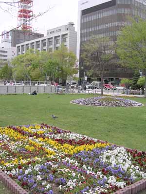 大通公園のパンジー。後ろ右は弊社の本社です。