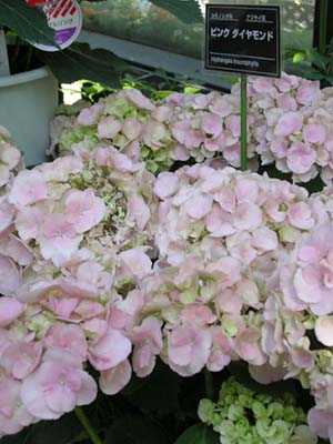 アジサイ展の全景。色とりどりのアジサイが並んでいます。