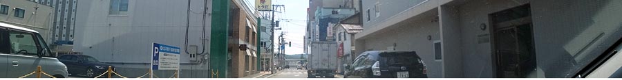 山下通り、かみむらキッズクリニック前から東宝ビル方向。前方右のピンクぽい建物はユニオンビル。
