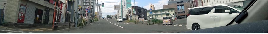 | 山下通りのとん田通り交差点から右、フクハラの駐車場方向。写真奥にイオン、写真右が美芳郵便局側。 |
