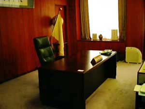 | 最後におまけの一枚は農林水産大臣の椅子。 そう、オホーツク管内選出のT部大臣が座っている椅子です。総革張りの重厚な椅子の前では謀管内のお偉いさんが大臣を囲んで「仕事中」です。私、熊オヤジも北海道ヒグマ連絡協議会を代表して、この冬の「越冬食糧の確保」と「自然環境破壊」を小声で念じるようにお願いしてきました。 |