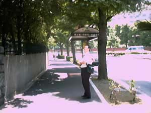 | 何処へワープしたかというと、永田町のG民党本部。見上げているヒゲのオヤジは熊オヤジではありません。 (似ていますが、実物は全身に毛が生えてます) |