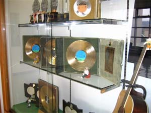 ギターのほかに、当時受賞した曲のゴールドディスクやトロフィーが展示してあります。