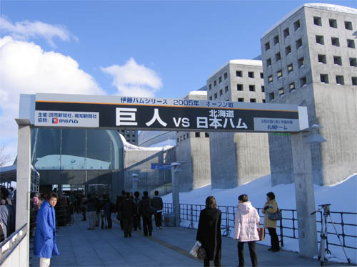 | 待ってました!今日の試合の「案内看板」です。なんか、もうワクワクです。 この日は「ジャイアンツ」が主催しているので、 ベンチはジャイアンツ1塁側、ファイターズが3塁側になります。 |