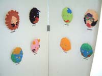 | 迷路のような白い世界の壁面に、今年この園を巣立つ子達の卒業製作の「お面」が飾られている。プラスティックの面に紙粘土で形成し、色とりどりに着色したものである。元はみな同じものなのに、出来上がりは個性豊かで見ていて飽きない。子どもの発想と想像力にはいつも驚かされる。五十嵐氏が「子どもの作品をアートだと気づいて欲しい」と言っていたのを思い出した。 |