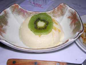 10品目「マンゴーアイスプリン」 中華のラストは杏仁豆腐でないの? キョウビ、コンビニでも食べられるものは出さないところがミソ。マンゴーをミキサーでつぶし、とろみが出たところで生クリーム、バニラアイスを加えて型にはめ、砂糖水の中にゼラチンを入れて・・・と延々複雑な作業でテーブルに並んだのがこれ。オカジマン小声で「うまい」「舌が喜んで小刻みに震える美味さ!」ってわかりま す? |