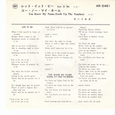 もちろんビートルズの有名な曲。テレビ東京の番組でも最後の語りの時に流れていたような。しんみりとしたいい曲ですね。このまえPVを見たらいつもとは違うバージョンだった。それもまたいい感じに不仲が見て取れるような。ジョージのギターソロも違って新鮮だったなぁ。いいよねぇ。こういうのがたくさんあって。今でも楽しめる。B面の曲はなんじゃこれて言う感じの曲。遊んでますね。