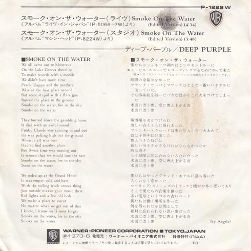 | スモーク・オン・ザ・ウォーター 名曲。ギターを弾いた人なら必ず弾くであろう有名なギターリフ。一説によると、この曲はアルバムを作っていて、全体を見たら、LPとしてどうしてもあと1曲分足りないので、なんとなく数合わせで作ったという。名曲ってそういう風に生まれるんですかね?さすがリッチーさん。このシングルはA面にライブ盤、B面にスタジオ盤というナイスカップリング。ライブインジャパン(今はメイドインジャパンかな?)の名演奏。ミスするやつね。初日の大阪フェスティバルホールの演奏ですねぇ。リッチーさんも真面目にソロを弾いてます。これがいわゆるライブのスタンダード。2日目と3日目のソロはもうなんか何これ?って言う感じになってますがそれがリッ |
