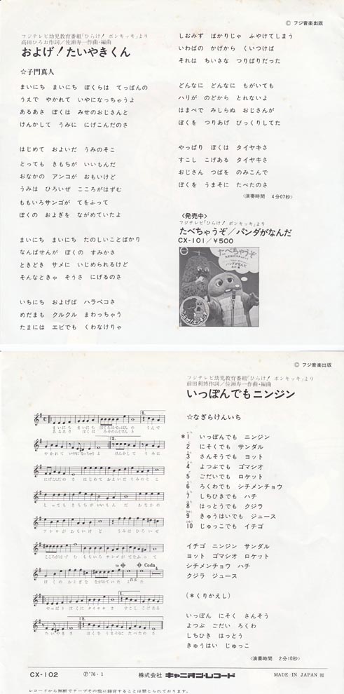 日本最高シングルの売り上げを記録したレコード。右下に「たべちゃうぞ」がありますが、これがポンキッキのレコード第1弾でほぼ売れなかったらしい。それでこのレコード発売の企画はなかなか通らなかったらしい。しかしやってみたら爆発的にね、売れてよかったねぇ。フジテレビ。しかも童謡だったので非課税だったらしい。2枚目は楽譜もあるし、いっぽんでもニンジンの歌詞もあるので載せました。いい歌詞でしょ。