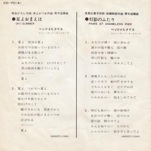 ベッツイ&クリスさんの4枚目のシングルで、北山修、加藤和彦のフォークルのコンビではなく、麻生ひろしさん作曲、井上かつおさん作詞でした。洋題はOh, Summerだそうです。でも聞くと明るくないんだよなぁ。日本語もしっかりしてないので洋楽を聞いている感じ。クレジットされているケニー・ウッド・オーケストラは森岡賢一郎さんが率いる楽団だそうで、ケニーが賢一郎のケニー、ウッドが森岡の森だそうで、ダジャレです奥様。