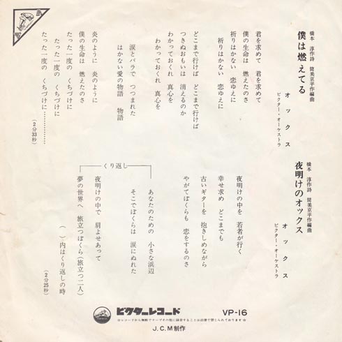 失神バンドのオックスの4枚目のシングル。作詞は橋本淳さん、作曲は筒美京平さんで、このコンビでGSのブルーシャトーや亜麻色の髪の乙女などを手掛けています。なかなかいい。オックスはバンドではなかったのかなぁ、だって、ビクターオーケストラって書いてあるよ。演奏してなかったのかなぁ。バックバンドがいたのかもね。