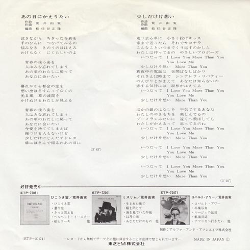 Youtubeでは1975年であろうユーミンがアーミースタイルで歌っているのがありました。ちょっと歌い方が違うので別の人かな?って思ったけど声がユーミンでした。貴重ですねぇ。ちなみにレコードのベースは細野さん、ギターは鈴木茂さん、はっぴいえんどですねぇ。キーボードは松任谷正隆さんです。ちぎった写真っていいですね。今はみなさんスマホなので削除してしまいますからね。憂いがないですね。