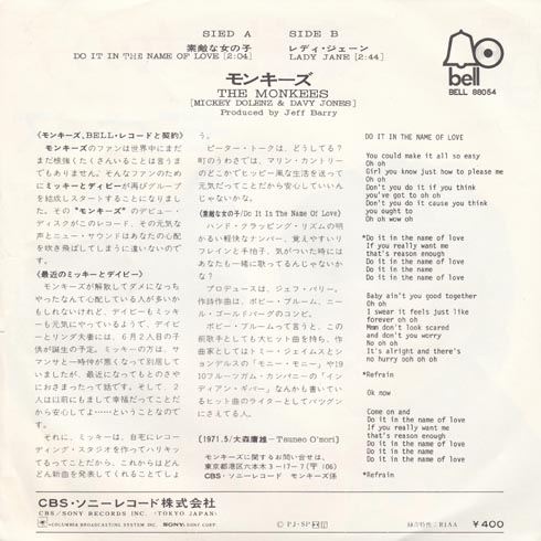 一応モンキーズ名義ですが、すでにメンバーはミッキーさんとデイビーさんしかいなくて、レコーディングはしたけどって感じだったらしい。んでこの曲も話題にもならず、正式に解散したそうな。しかしこの後1980年代になってリバイバルで人気が出たそうな。このレコード買った人は相当なファンですね。解説は大森庸雄さんで、Youtubeではデビーギブソンにインタビューしている大森さんが見られました。英語ペラペラでした。かっこいい。
