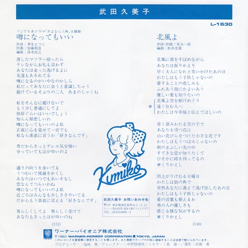 ご自身が主演のドラマ「さよなら三角」の主題歌だったそうです。聞いてみるとどうでしょうかなぁって感じでしたね。加藤和彦さんの作曲だけど、そうかなぁって感じ。レコードもシングル5枚ですので、あまり歌は好きではなかったのかな。映画ハイティーンブギでマッチさんとキスシーンがあって、かなりファンに恨まれたそうです。芸能人はつらいねぇ。