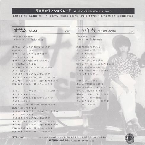 長南百合子とシルクロードの曲。長南は「ちょうなん」ではなく「おさなみ」って読むんですね。ローマ字で書いてあって、今知りました。これもなんか失恋ソングですかねぇ。しかし、曲の題名としては「オサム」はどうでしょうかなぁ?ちなみに長南さんは北海道の人らしいです。
