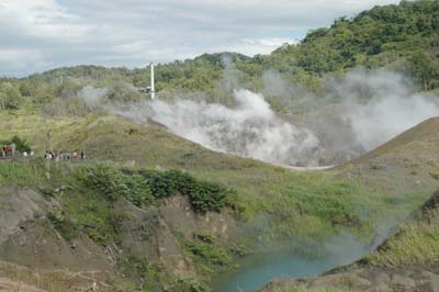 少し歩くと、火口全景が見えます。水蒸気がもうもうと立っています。