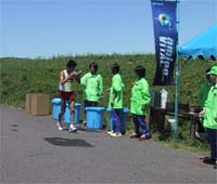 「90キロ地点」関門スタッフ。常呂中学校の2年生と先生。