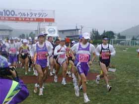 目の見えない方の参加もありました。伴走の方と一緒に走ります。そういう方が通ると、耳に届けと大きな「がんばれ〜!」の声がひときわ高く響きました。手をつないで見事にゴールされていました。素晴らしい100キロです。サロマの開会式の時に手話通訳がついていましたが、耳の聞こえない方の参加もありました。お仲間と手話で連絡をとりつつ走っておられました。