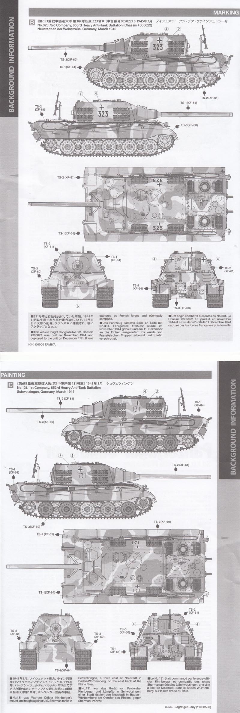 カラーリングのBとCです。BはAtと同じノイシュタット・アン・デア・ヴァインシュトラーセでアメリカ軍とたたかったそうです。ちょっとカラーリングが違いますね。Cは第653重戦車駆逐大隊 第1中隊の313号車のキンベルガー曹長車の車両だそうです。ライン河東のシュヴェツィンゲンでアメリカ軍シャーマンとたたかったそうです。後半に戦車はよく資料が残ってますね。
