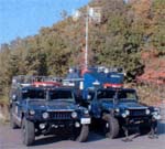 今回投入される車輛は、「災害対策無線車」と「災害対策支援車」で、アメリカのAMゼネラル社製で車名はHUMMER(ハマー)。「災害対策無線車」は携帯電話基地局装置・発電機などを搭載しており、災害時などに出動して重要通信の確保にあたり、携帯電話を最大34回線、PHS(64K対応)最大7回線を確保するという。一方「災害対策支援車」は災害対策無線車とペアで移動し、器材運搬や人員運搬に活躍する。また、PHS基地局としても設置可能で、最大7回線を確保することが出来るという。また、両車輛ともインフォメーションボードを搭載することが出来、いわゆる電子掲示板の機能を備えており、状況掲示や誘導案内にも活用できるそうです。
