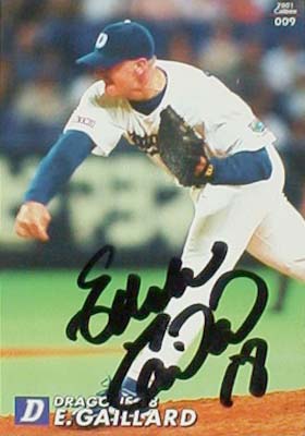 | エディー・ギャラード EddieGaillard (元中日、現横浜ベイスターズ) 昨日も紹介しましたが、今日もギャラード選手。このカードはいつもの野球カードではなく、皆さんご存知の「カルビープロ野球スナックカード」であります。サイズはいつものカードより少し小さいものの、簡単に手に入るし、おまけにポテトチップスも付いているのでお得。皆さんどんどん買ってカード集めましょう。楽しいですよ。ちなみにサインの下にある18は背番号。昨日のカードは2000年の写真を使っていたので、52番が背番号でした。でも活躍したら、エース番号も簡単にもらえちゃう、中日ってどお? |