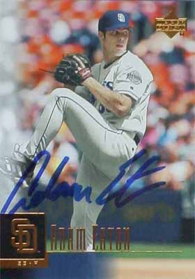 | アダム・イートン AdamEaton (サンディエゴ・パドレス) 昨日も紹介いたしましたイートン選手。今日のは白い(灰色?)ユニフォームですね。サインのほうも昨日より『ADAM』と読めやすくて結構結構。そういえば、元近鉄、現中日の大塚さんはポスティングシステムでこの弱小パドレスに30万ドルで移籍するそうな。がんばってほしいね。でもパドレスには抑えのホフマンというすごいピッチャーがいるから、きっと中継ぎなんでしょうね。ぜひサインほしいなぁ。がんばれ大塚。 |
