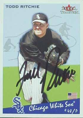 | トッド・リッチー ToddRitchie (タンパベイ・デビルレイズ) 1997年ミネソタでデビュー。1999年ピッツバーグで15勝と活躍し、2002年シカゴ・ホワイトソックス、2003年ミルウォーキー、2004年タンパベイと、まことに忙しく移籍する選手ですな。タンパベイにいるって言うことは、今年の3月に来日するかな?松井くんには打たせてあげてね。ところでサインは「R」のところがムーミンの「ニョロニョロ」に似てるのがいいね。 |