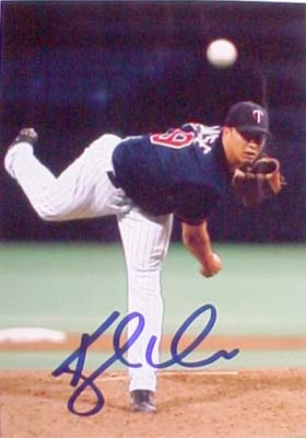 | カール・ローズ KyleLohse (ミネソタ・ツインズ) 2001年にデビュー。2002年に13勝、2003年に14勝と確実にいい成績を上げてきています。今年も一応ローテーションを守っているはず。カードを見る限りでは、メジャーピッチャーがよくそうである様に腰高、って言うか、あまりステップを大きく取らない、日本で言うところの手投げに近い感じ。メジャーでは形にはこだわらないからいいんでしょうが、日本のコーチにかかると、あっという間に直されちゃうらしいよ。コーチは教え魔が多いらしいから・・・。 |