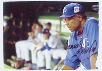 | フランク・ロビンソン FrankRobinson モントリオール・エキスポズの監督さんです。日本じゃ名選手イコール監督って言う感じ(落合さんや王さん野村さん長島さんね)ですが、メジャーでは有名な選手が監督するって言うのは珍しいです。このロビンソン監督は現役時代の成績もすばらしく、オールスター12回、1961年にはMVP、1969年には三冠王になっています。通算本塁打数は586本。彼はアメリカンリーグですが、そのときのナショナルリーグのホームラン王は、ハンク・アーロンでした。そういう時代の選手です。なんか王監督みたいだね。 |
