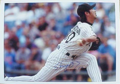 | 高津臣吾 (シカゴ・ホワイトソックス) 元ヤクルトスワローズの守護神。日本シリーズで最も活躍したクローザーと言ってもいいでしょう。その高津さんは今年メジャーに挑戦。35歳ながらいい働きをしました。6勝4敗19セーブ。セーブランキング10位でしたね。この前の「ジャンクスポーツ」でも出演していました。年俸が今年1億数千万円でしたが、来年は2億数千万になるそうです。すごいですね。でも日本にいた方がもっともらえてましたけどね。お金じゃないんですね。日本食をこよなく愛する高津さん。来年もテレビにたくさん映るようにがんばって!(バラエティ番組じゃなくてね)ちなみに今日でサイン天国700回を迎えました。あと300回は続けたいですが、もうそろそろ在庫がぁ・・・。1000回目指してのんびりがんばります。みなさんミテネ! |