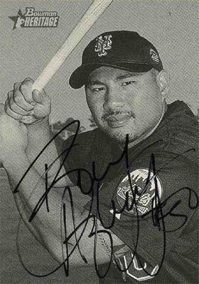| ベニー・アグバヤニー (千葉ロッテ・マリーンズ) 昨年ロッテに来た優秀外国人選手。打率3割1分5厘。100打点。130試合出場。打率3割超えてる外国人選手野中では1番。2位はファイターズのゼギノールの3割5厘。3話位以上はこの2人。なのにみなさんへの認知度はかなり低いと見た。ちょっと見はただのおっさん顔だけど、とてもいい人です。だっ て、この2枚のカード、マジックを変えてますよ。太さが違うもん。みなさんベニーさんも応援しましょう。 |