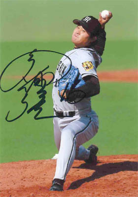 | 安藤優也 (阪神タイガース) 昨年までは抑えでしたが今年から先発に回っております。しかし、この前の紅白戦では島谷選手にホームランを打たれたりしていいところがなかったようです。まぁ、心構えが抑えと先発では違いますから、ぼちぼちいきましょ。ちなみに彼は2001年のドラフト1位(自由獲得枠)です。このカードの裏には2002年の2位とかいてありますが間違いですね、きっと。2001年のドラフトではダイエーの寺原選手が有名。カードのパッケージにもなった選手です。しかし、そこそこですね、今は。サインがちょっと手で触れられていてずれているのが残念。 |