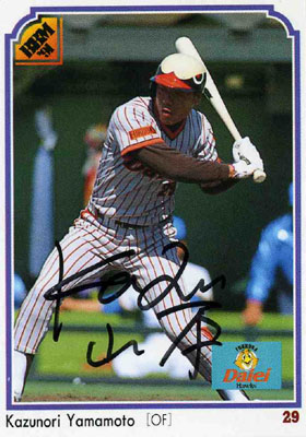 漫画あぶさんにも出ていました。よく耳が聞こえないという事だったような。カードはダイエー時代のですね。ヘルメットがユニークでしょ。強くなさそうです。