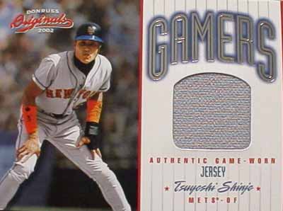 | これが普通のジャージーカード。選手は見てお分かりの新庄君。非常にわかりやすい。写真のジャージーを切って挟んだんだなぁ、って感じするでしょ? |