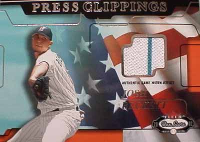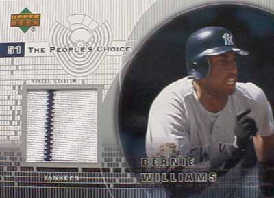 | 一般的なトレーディングカードには、普通の写真だけが載ってる「レギュラーカード」と、キラキラ仕様の「インサートカード」と、選手が使っていたユニフォームやバットをカードに挟んだ「ユーズドカード」に分かれます。この「ユーズドカード」がいわゆる「ラッキーカード」。1箱に1枚か2〜3枚入っているわけです。1997年にアッパーデック社が始めてジャージーを挟んだカードを800分の1の確立で出したのが始まりです。はじめはただ、ジャージーが挟んであればよかったのですが、カード会社はあれこれといろんな付加価値を含めたユーズドカードを出すようになりました。そこで、今日から数回にわたって、そのユーズドカードを紹介してみよう、という企画です。トレーディングカードの世界を少し味わって見ましょう。 |