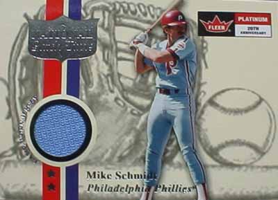 | これはわかりやすい色でしょう?フィリーズの水色。ただこれは現役選手ではなく、先日もサイン天国で紹介した、マイク・シュミット選手。ですから、このジャージーは現在使われておりません。野球殿堂入りの選手のジャージーを切り刻んでいいのか?っていうことにもなるけど、付加価値が付いてちょっとお値段がお高くなっているところがミソ。でもメジャーはファンを大切にするので、たまにこのジャージーを着て「レトロ」風な試合もするんですよ。 |