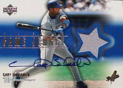 | これは、ジャージーだけでなく、サインも付けたぞって言うスペシャルなカード。ジャージーも星型ですし、サインも変わっているでしょ?「サイン天国」とは違ってこのサインにはかなりの付加価値が付きます。ジャージーだけのものより倍以上のお値段。ちなみの選手がサミー・ソーサ選手あたりだと300$です。これはその10分の1です。 |