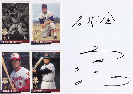 名球会の方からは3名の成功です。まずは土井正博さん。近鉄の頃はよく知りませんが、ライオンズの頃の後半見た事があります。田淵君や野村さんがいた頃ですよね。現在は白髪のナイスミドルになっていたそうです。サインの名球会と3は読めても、お名前は全くなんだかわかりませんな。それが良いのかも。