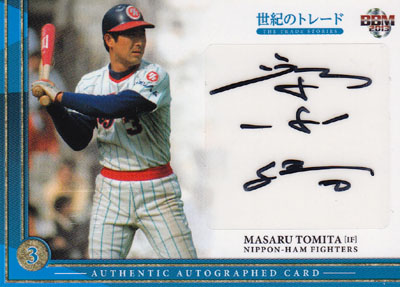 元日本ハムファイターズの内野手。いわゆる、法政三羽ガラスといわれた、田淵、山本、富田の富田さんです。もちろんドラフト1位。はじめは南海ホークスでした。その後讀賣ジャイアンツに移籍し、長嶋茂雄さんが怪我したV9の日本シリーズにも出場していました。王選手の756号を打ったときに後ろで大ジャンプしている張本さんとトレードで日本ハム移籍。で、このカード。これはたまたま買ったパックで出てきた正規のサインカード。金額が発生しますよ。オークションなら500円ぐらいかな?