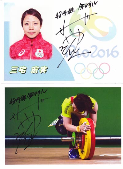 ご存知、三宅さんです。あまりにも印象的だったバーベルをなでている画像にもサインをいただきました。ありがたい。もう腰が痛くてあがらないと思ったそうです。良かったですね。ウエイトリフティングのみなさんは優しいですね。4人ともサインをいただきました。